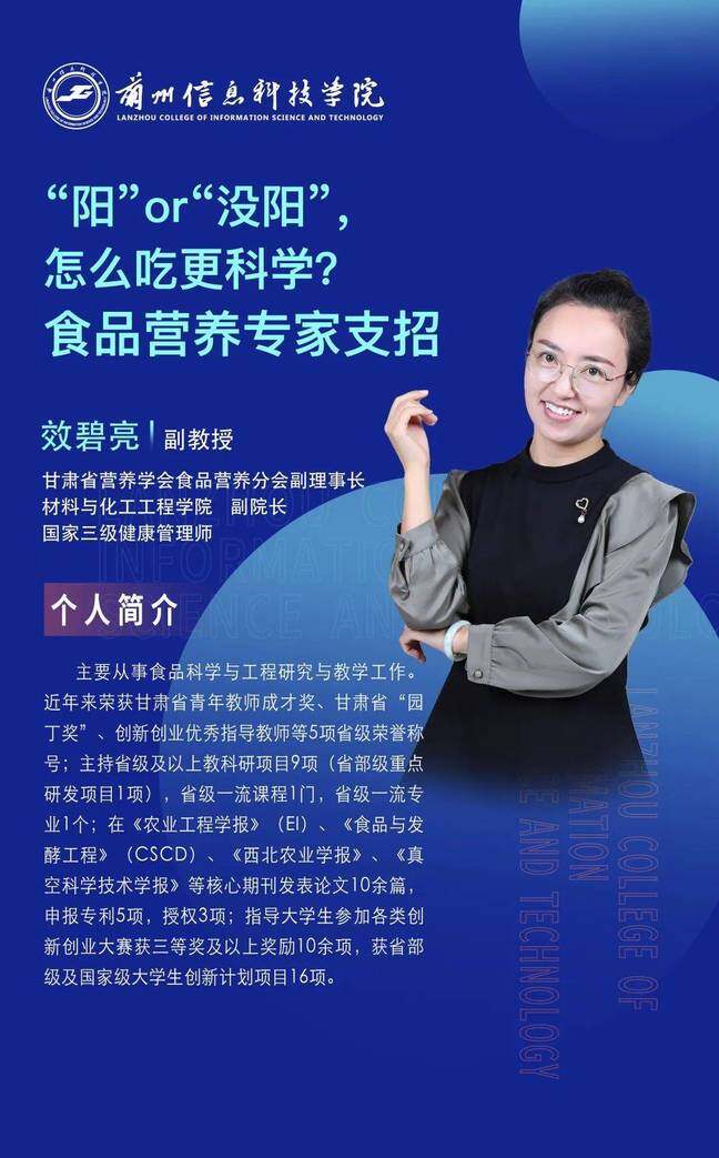 小科特别邀请到beat365英国官方网站材料与化工工程学院副院长、甘肃省营养学会食品营养分会副理事长、国家三级健康管理师效碧亮副教授为大家支招!