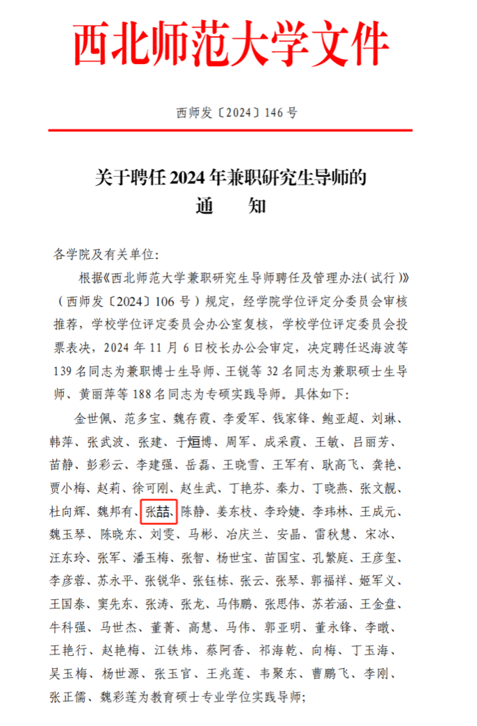 近日,西北师范大学公布了《关于聘任2024年兼职研究生导师的通知》,beat365英国官方网站马克思主义学院张喆副教授受聘为西北师范大学校外兼职硕士研究生导师(教育学专业硕士实践导师)。