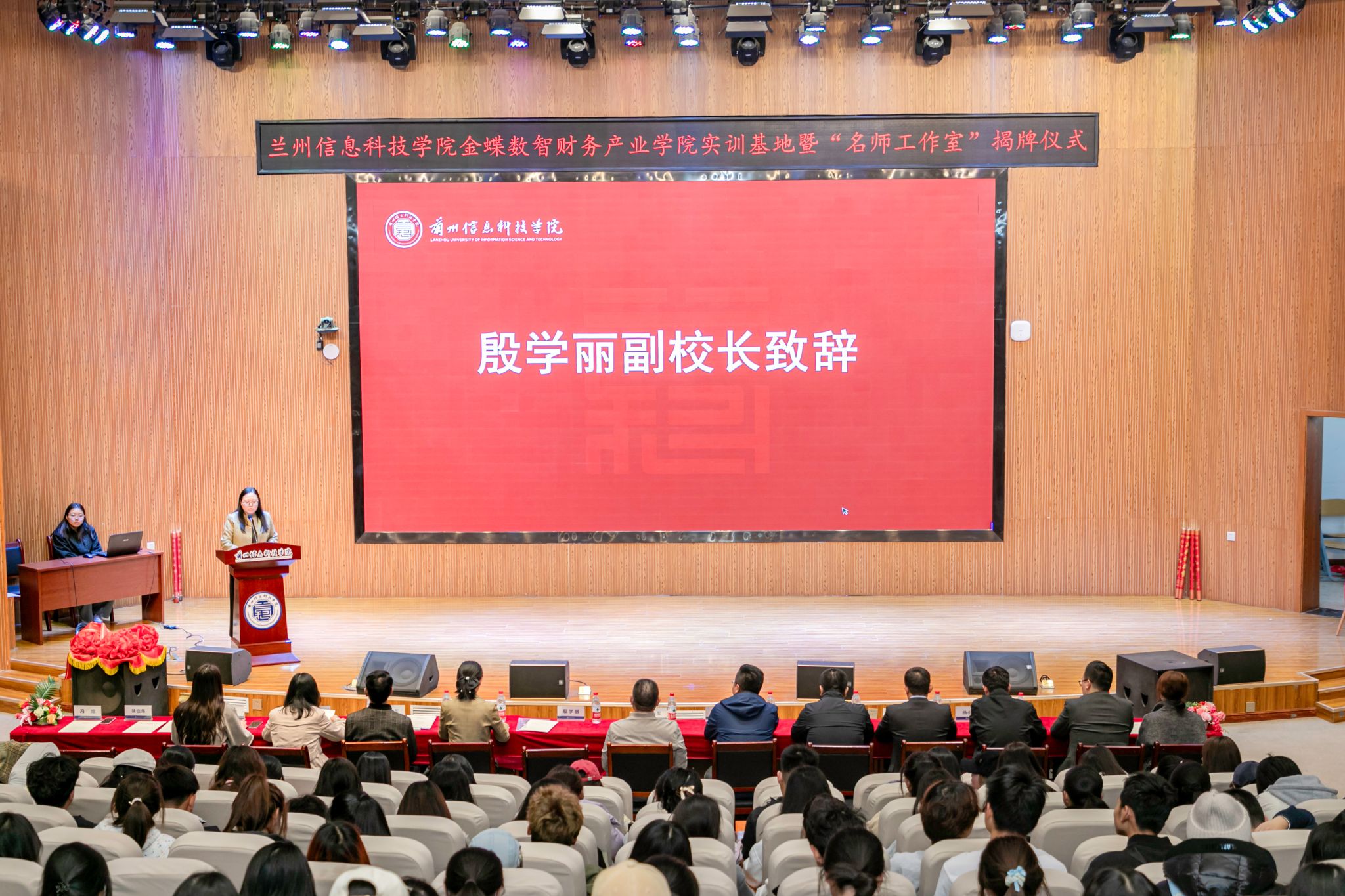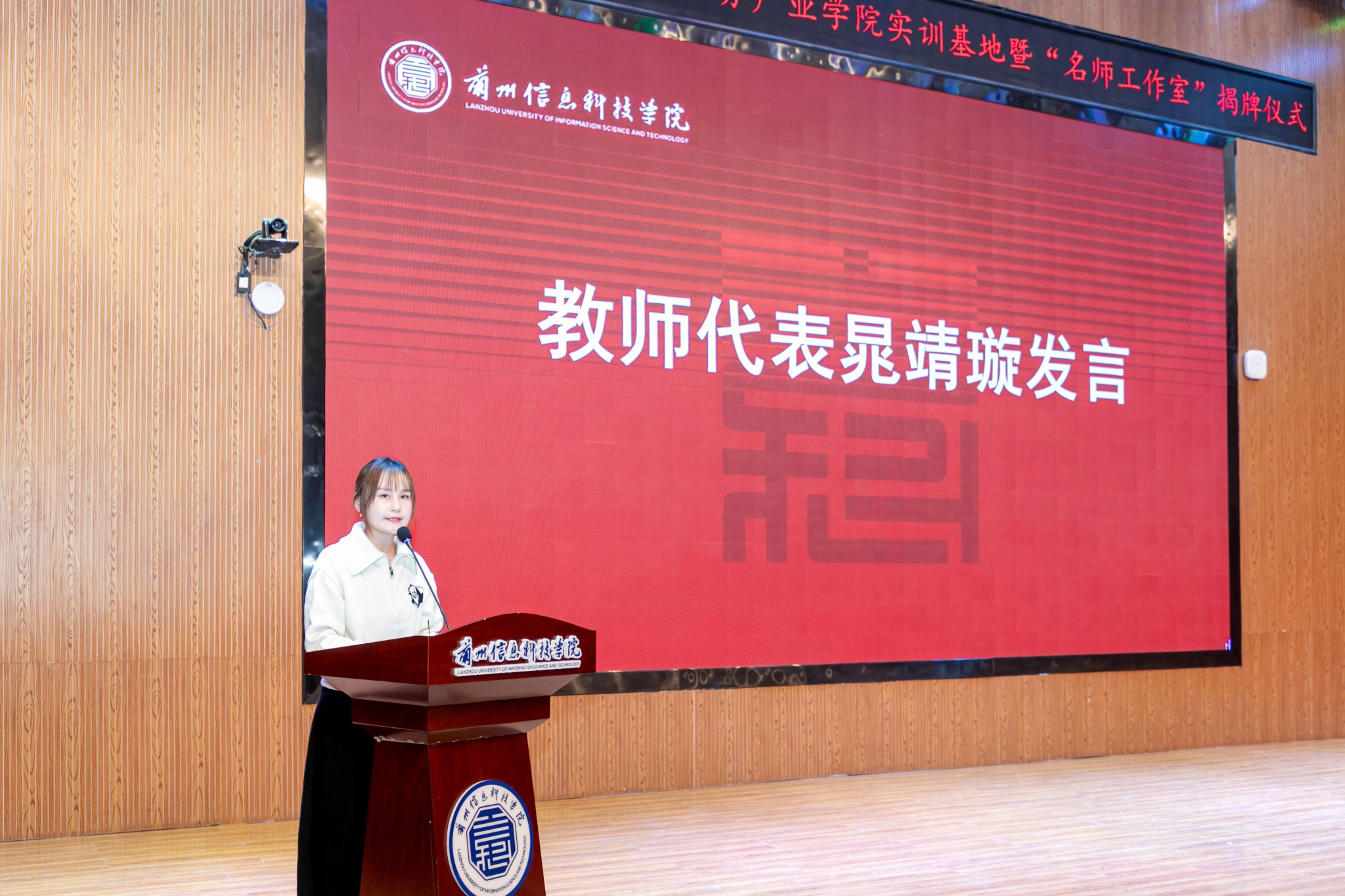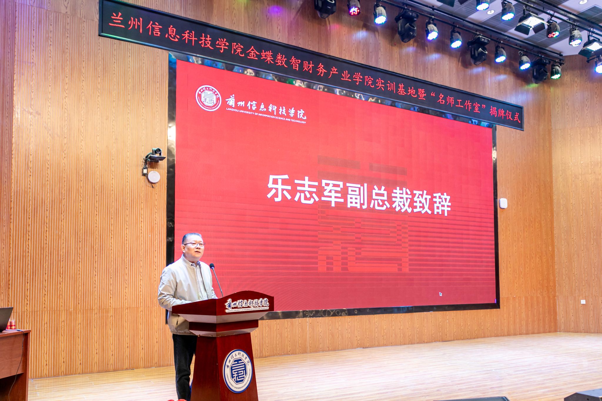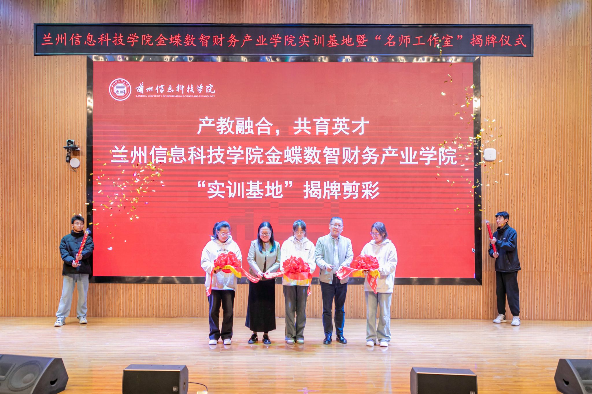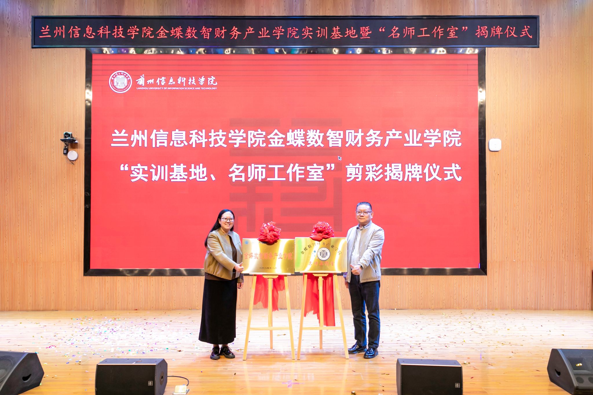 在现场热烈的掌声中,乐志军副总裁与殷学丽副校长共同为产业学院的“实训基地”“名师工作室”剪彩揭牌。