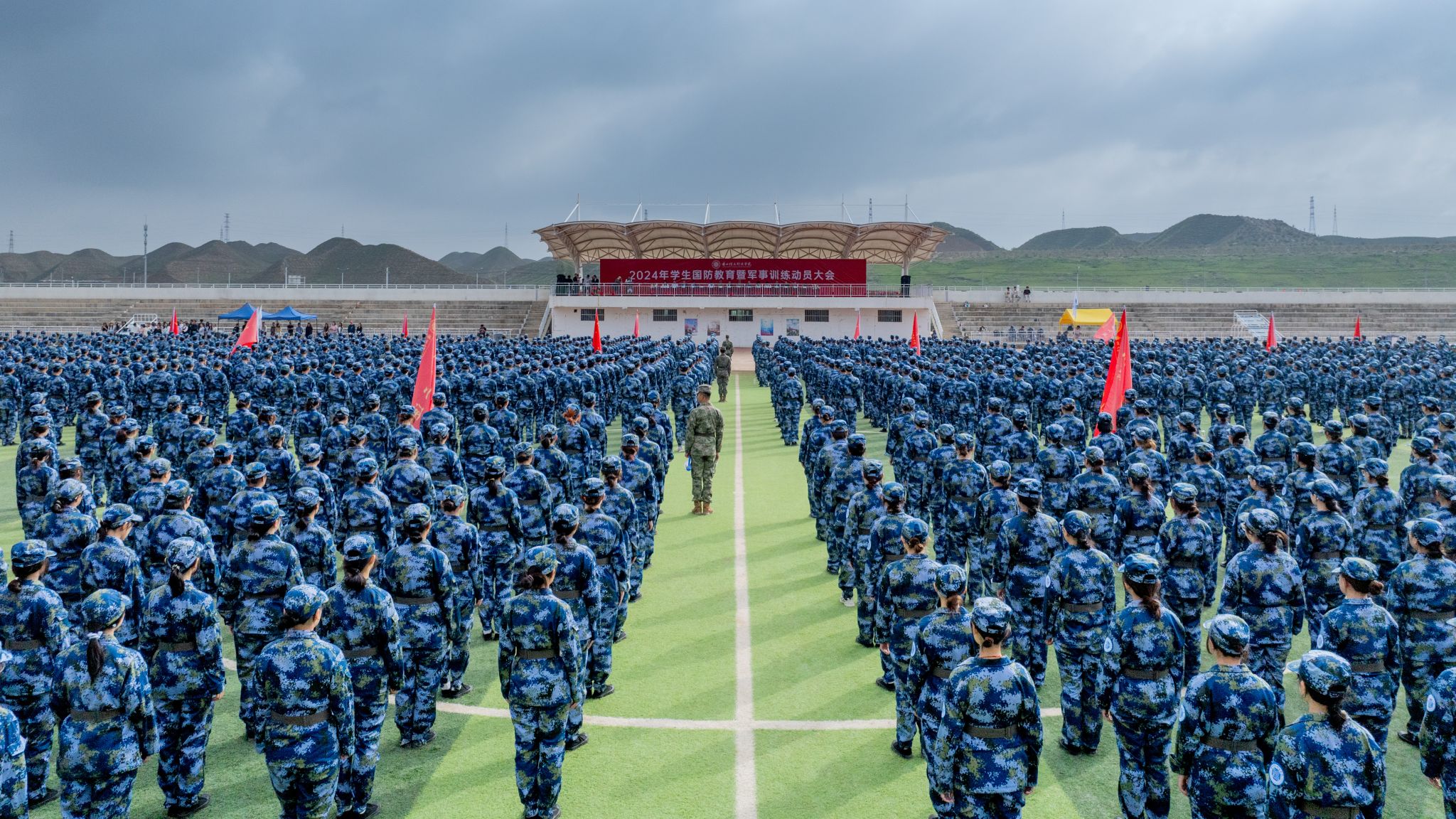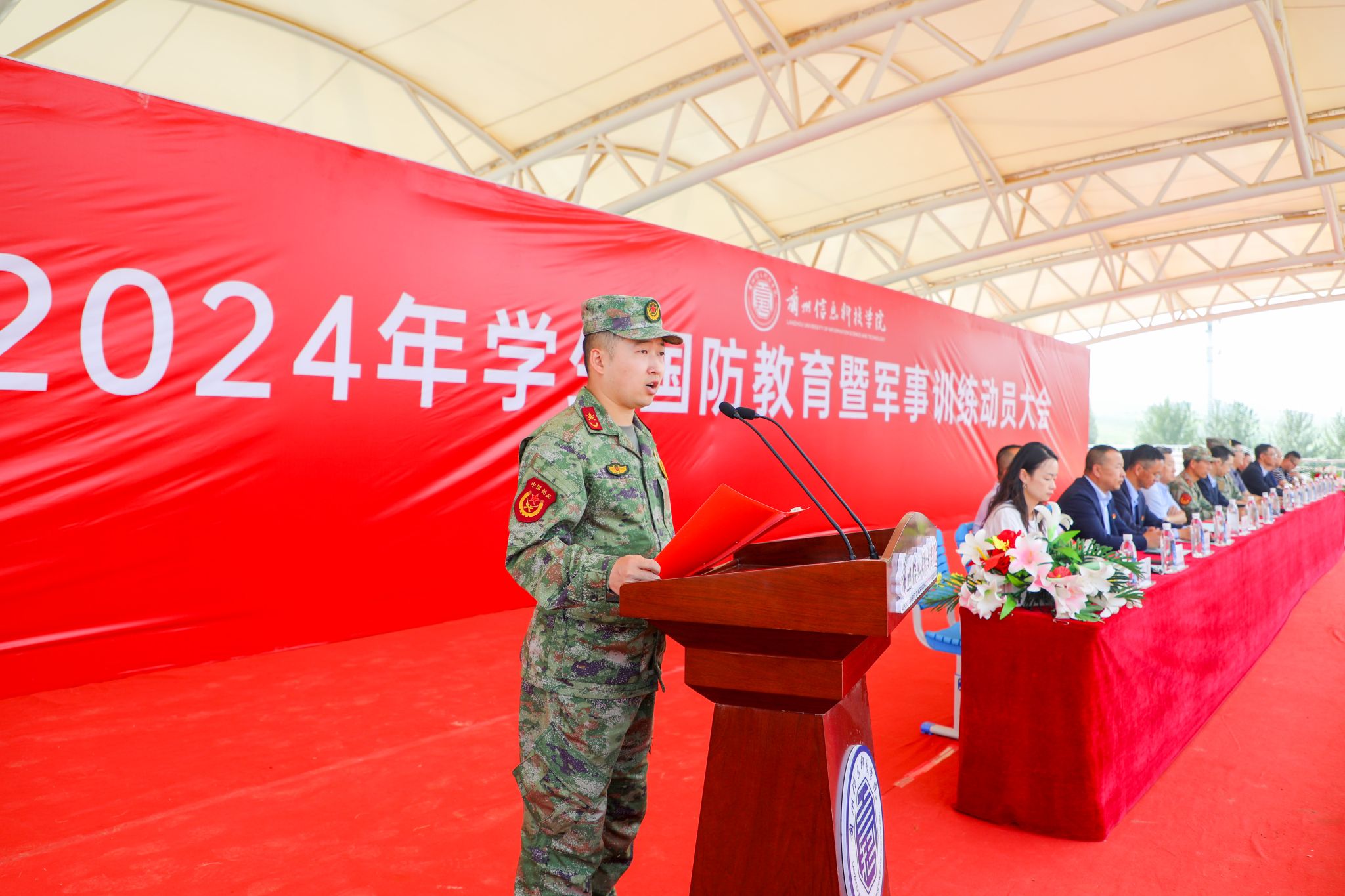 在秋姿飒爽的初秋,beat365英国官方网站新生们迎来了入校后的“开学第一课”——国防教育及军事训练。8月26日上午,2024级新生以一场庄严而热烈的国防教育暨军事训练动员大会正式拉开了他们大学生活的序幕。兰州市榆中县人民武装部副部长、军训团团长陈耀伟,兰州警备区战备建设处参谋、军训团副团长兼总教官李杰,兰州新区西岔园区教科文体局副局长茹思鹏,全体校领导及各二级学院院长、全体教官、教导员(辅导员)参加了动员大会。
