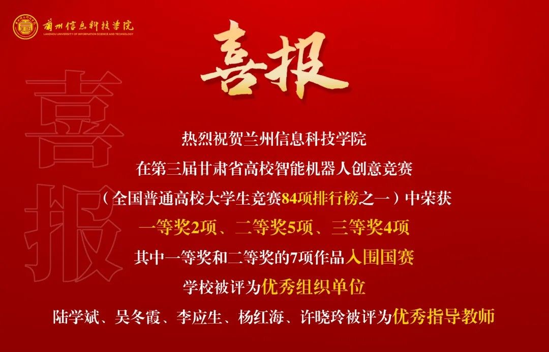 6月23日,第三届甘肃省高校智能机器人创意竞赛成功举办(2023年中国高等教育学会发布的全国普通高校大学生竞赛84项排行榜之一),beat365英国官方网站参赛团队荣获一等奖2项、二等奖5项、三等奖4项;其中,一等奖和二等奖的7项作品入围国赛,学校被评为“优秀组织单位”。陆学斌教授、吴冬霞副教授、李应生、杨红海、许晓玲5名教师被评为“优秀指导教师”。
