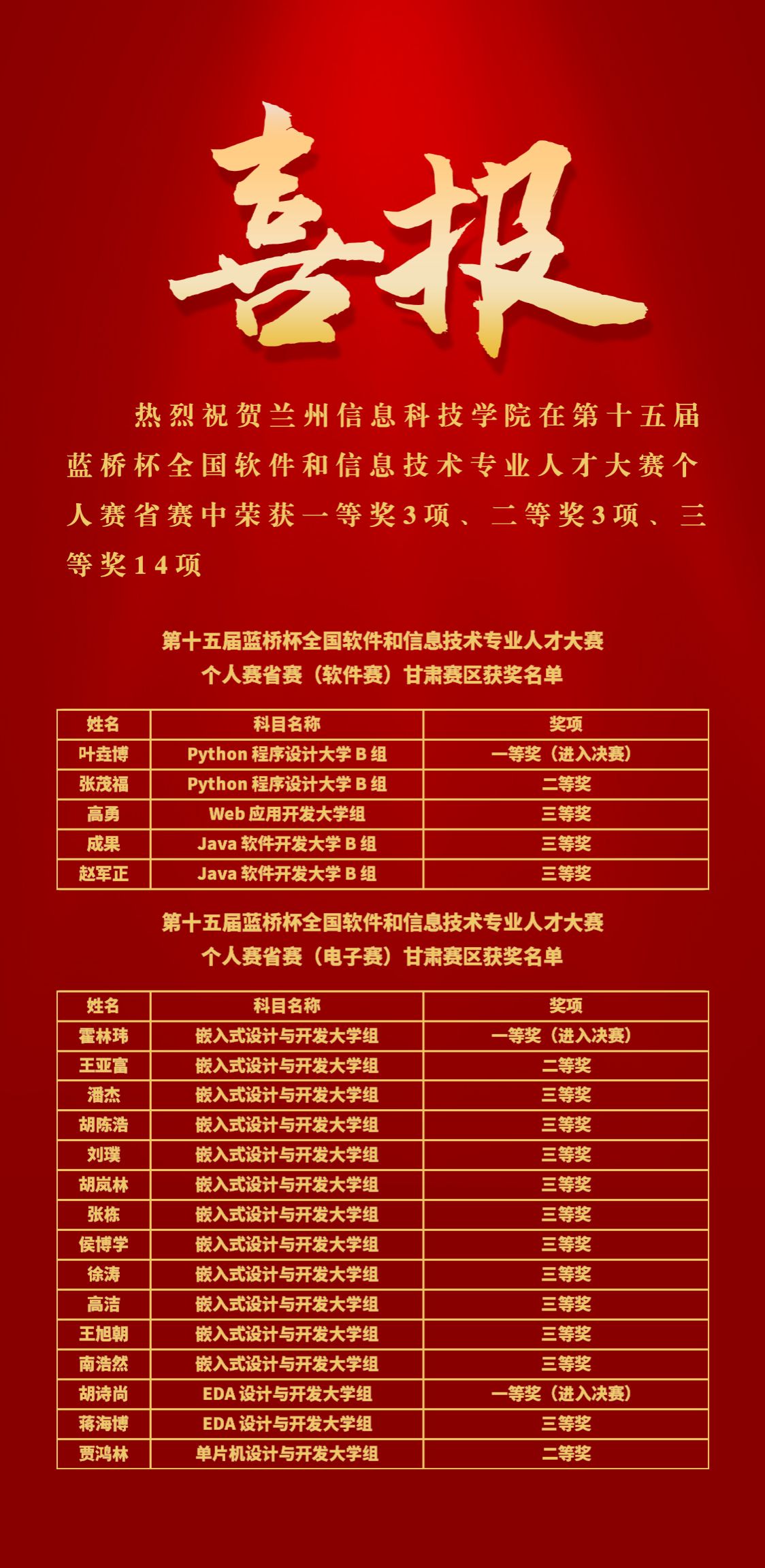 近日,由工业和信息化部人才交流中心主办的第十五届“蓝桥杯”全国软件和信息技术专业人才大赛个人赛省赛甘肃赛区获奖名单公布,beat365英国官方网站学子经过激烈角逐,荣获省一等奖3项,二等奖3项,三等奖14项,其中计算机与人工智能学院叶垚博等3名学生凭借出色的表现,在省赛中脱颖而出,荣获一等奖,并成功晋级参加国赛。