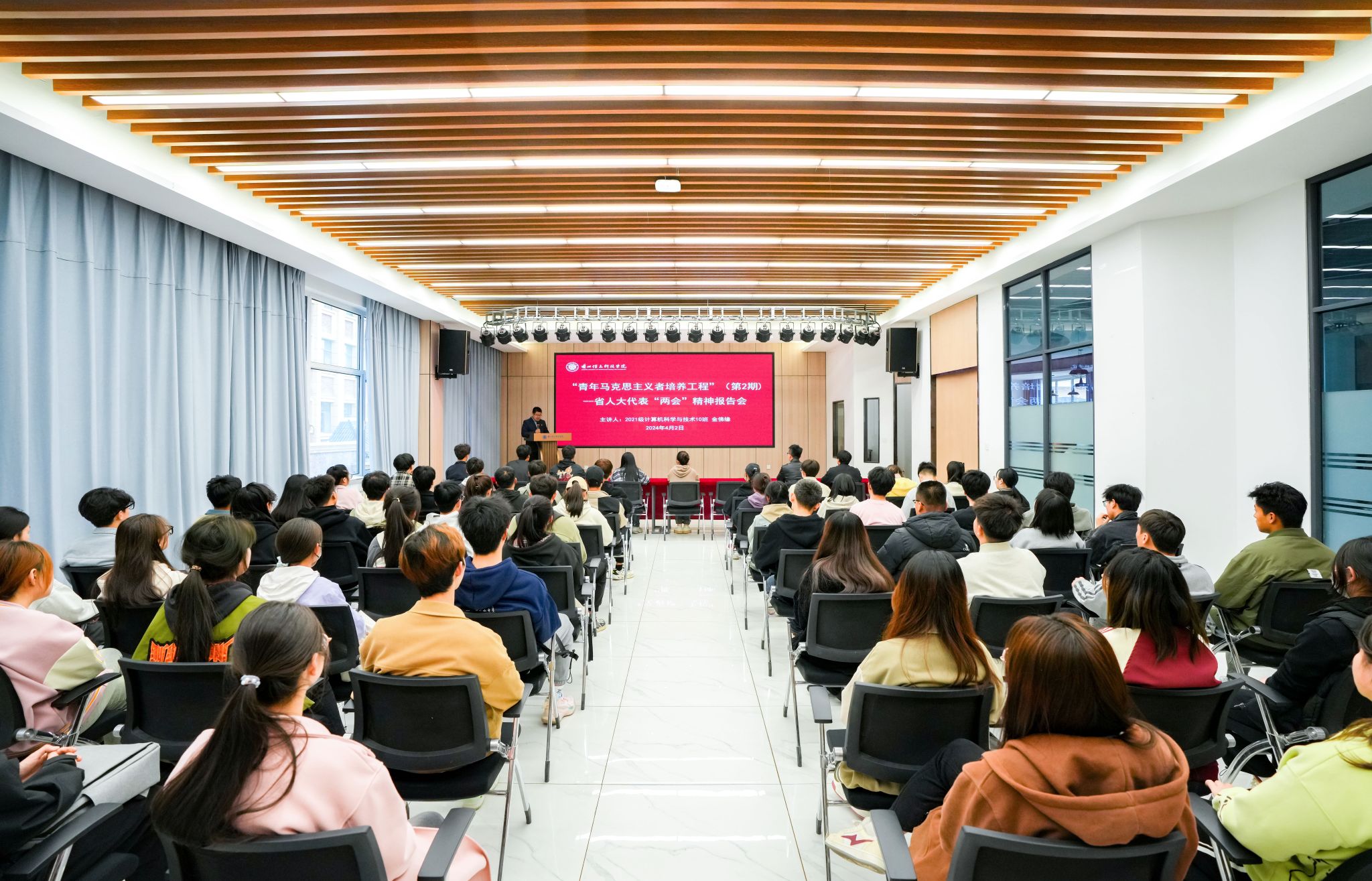 省人大代表金佛缘同学通过对“两会”背景、主要议题和精神要点进行解读,让同学们对“两会”精神有了初步了解,随后重点解读政府工作报告中提出的关键内容,包括经济发展重点、社会建设目标、科技创新举措、生态文明建设等,同时对人大职能展开了全面解析,带领学员们深入理解立法、监督、决策和任免权等知识点。讲座尾声,金佛缘与现场学生就如何将“两会”精神融入到日常学习和实践中,以及如何为实现中华民族伟大复兴的中国梦贡献青春力量等问题进行了亲切的互动交流。他倡导大家要珍惜大学学习时光,热爱学校,争做立志报国的好青年。