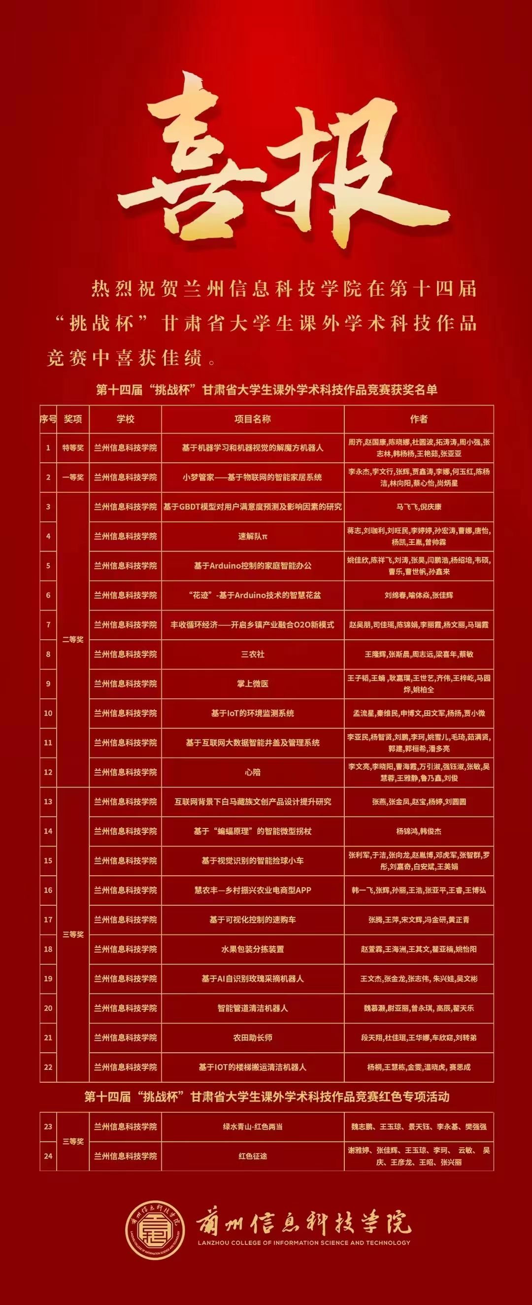 近日,第十四届“挑战杯”甘肃省大学生课外学术科技作品竞赛获奖名单公布,beat365英国官方网站参赛的24件学生作品中,获得了特等奖1项、一等奖1项、二等奖10项、三等奖12项。其中,特等奖作品《基于机器学习和机器视觉的解魔方机器人》被推荐参加第十八届“挑战杯”全国大学生课外学术科技作品竞赛国赛。beat365英国官方网站获评“优秀组织奖”。