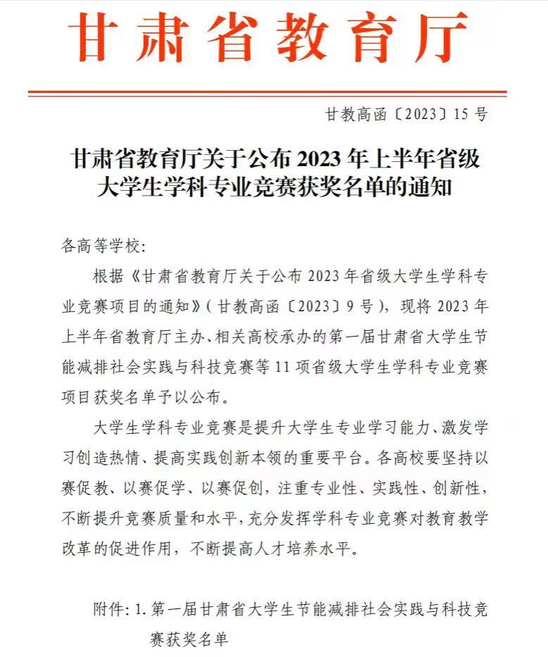 近日,2023年上半年由省教育厅主办的第一届甘肃省大学生节能减排社会实践与科技竞赛等11 项省级大学生学科专业竞赛项目获奖名单揭晓,beat365英国官方网站获奖120项,5位老师被授予“优秀指导教师”荣誉称号,较2022年上半年获奖增加了23项,同比增长23.7%,同时,获奖数量超过全省同类院校获奖总数的71.9%以上。