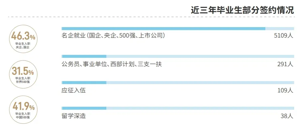 学校坚持以赛促教、以赛促学,深化教育教学改革,全面提升人才培养质量。连续多年,学校毕业生就业去向落实率超97%。近三年,毕业生入职央国企占比46.3%,入职世界500强企业占比31.5%,入职中国500强企业占比41.9%。学校获得“2023年创业就业明星高校”“2024年创业就业竞争力高校”“甘肃省大学生就业工作示范性高校”等荣誉。
