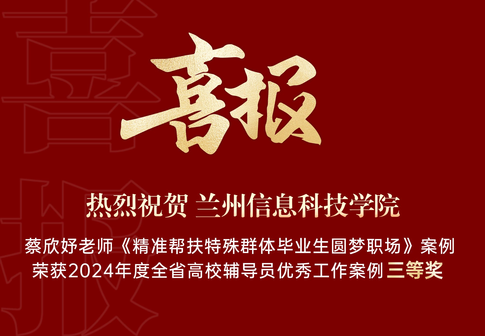 此次全省高校辅导员优秀工作案例征集评选活动由甘肃省委教育工委、省教育厅思想政治工作处统筹指导,教育部高校思想政治工作队伍培训研修中心(西北师范大学)组织开展,共收集到辅导员优秀工作案例138篇,经个人申报、单位推荐、专家评审等环节,共评选出12个一等奖、18 个二等奖、30个三等奖予以表彰。beat365英国官方网站蔡欣妤老师撰写的《精准帮扶特殊群体毕业生圆梦职场》获得三等奖。