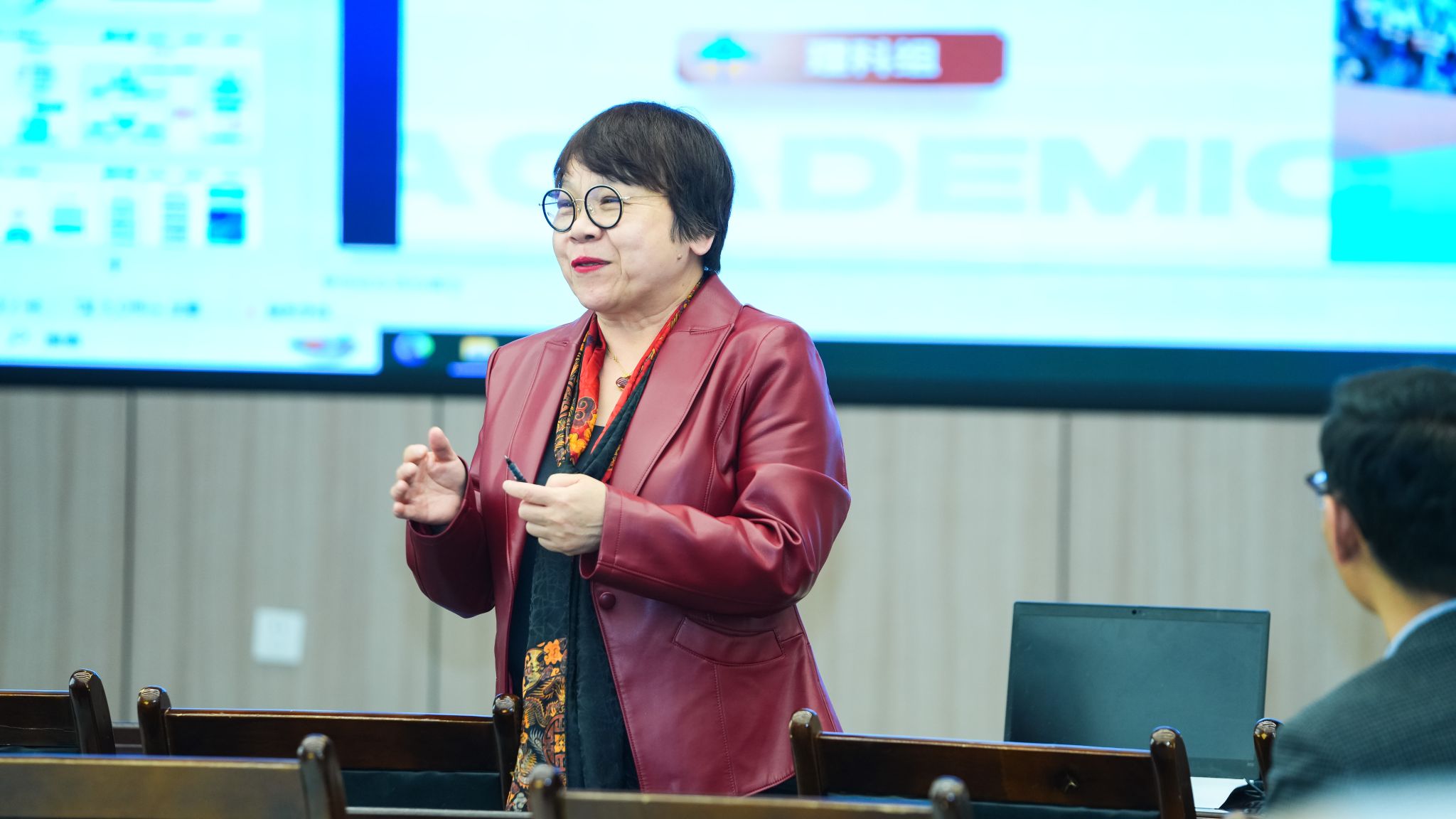 郭志碧副主任介绍教学竞赛组织与支持,耐心细致指导学校教创赛种子团队教学创新成果报告和现场教学汇报,提出中肯意见建议。