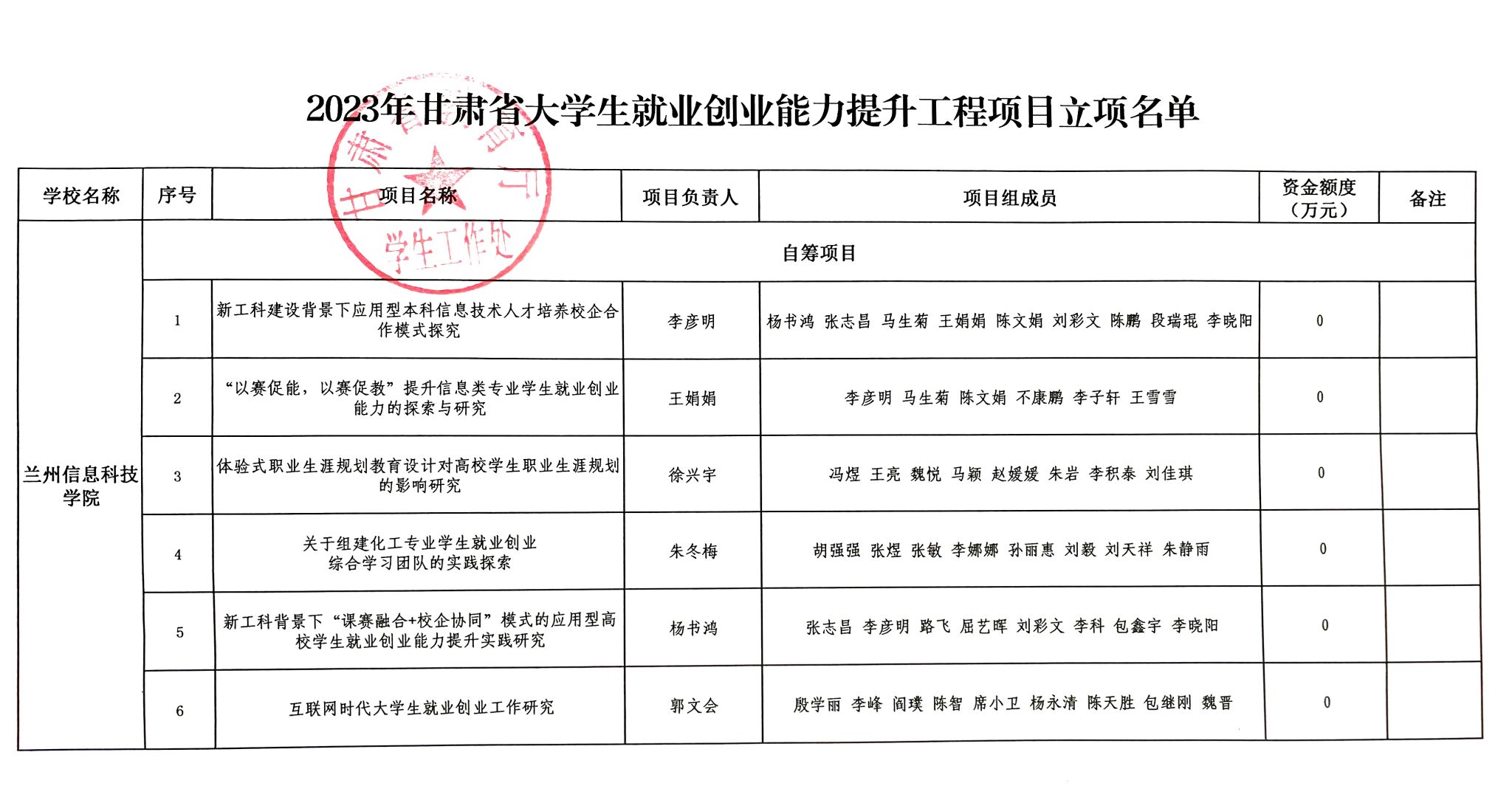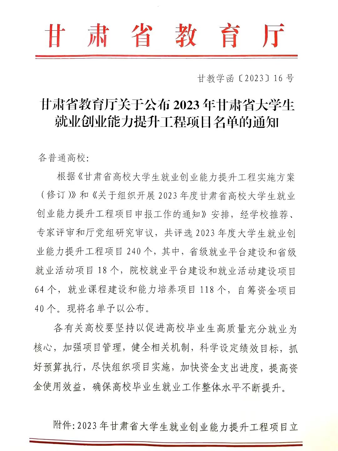近日,甘肃省教育厅公布了《2023年甘肃省大学生就业创业能力提升工程项目名单》,beat365英国官方网站《新工科建设背景下应用型本科信息技术人才培养校企合作模式探究》等6个自筹资金项目获批立项,学校就业创业工作取得新突破。