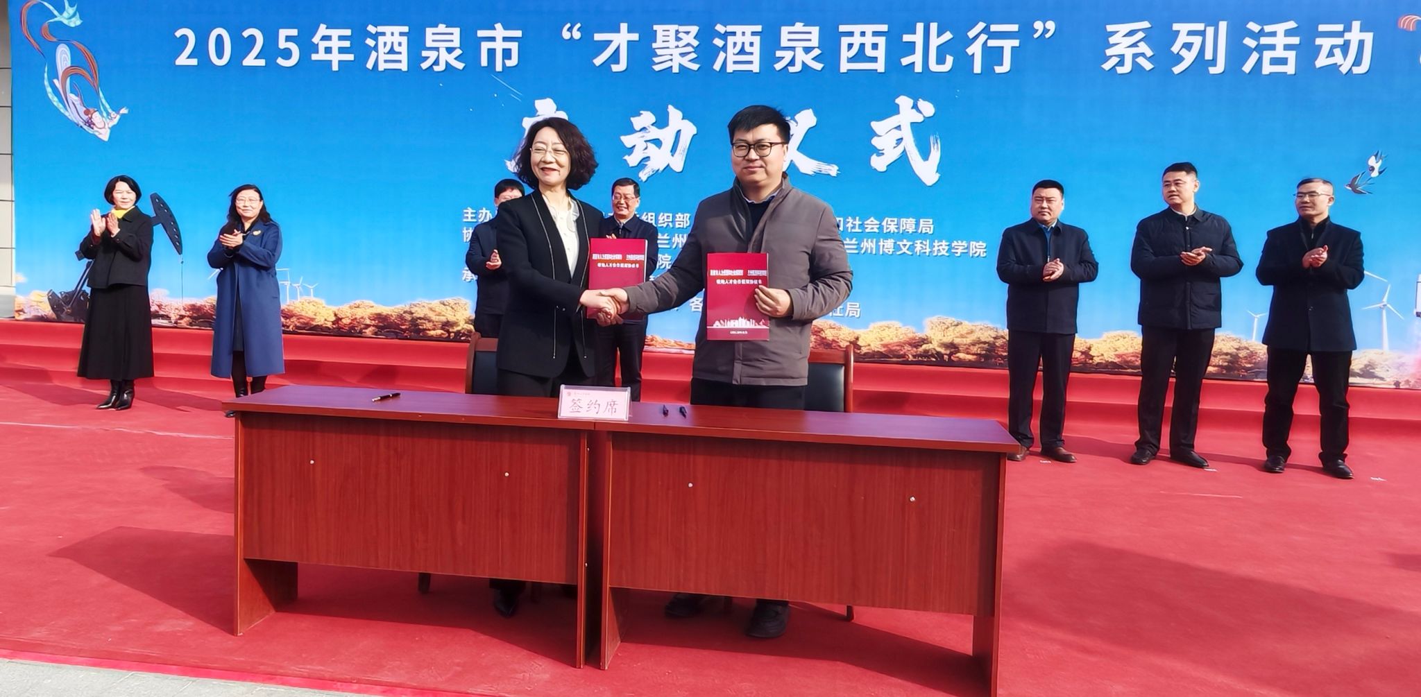 启动仪式上,中共酒泉市委组织部、市人社局与beat365英国官方网站签署人才合作协议,双方将在人才引进、定向培养、就业服务等领域深化合作。苏存兴表示,此次合作将依托酒泉市产业需求,精准对接高校教育资源,为毕业生搭建“校招直通车”,推动人才供给与区域经济发展“双向奔赴”。