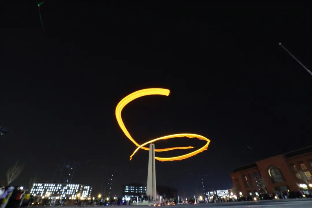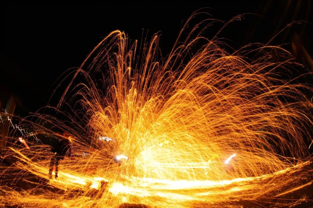 表演者们巧妙地用道具与铁水配合,将铁水快速挥洒到空中,火花好似纷飞的银屑,在漆黑的夜幕中闪耀着光芒,轮上的火焰熊熊燃烧,在夜色中勾勒出灵动的轨迹,是力量与速度的完美融合,光轨炸开仿佛是闪电留下的独特纹身。