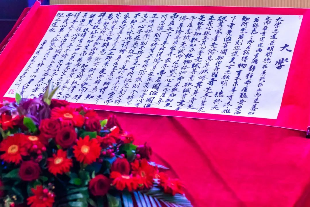 欲治其国者,先齐其家;欲齐其家者,先修其身;欲修其身者,先正其心。千年前的大学之道响彻体育馆,全场师生齐诵《大学》,在历史和现实的交错间,赓续兰科精神血脉,传递出兰科人,“自强、卓越、报国”的坚定信念。