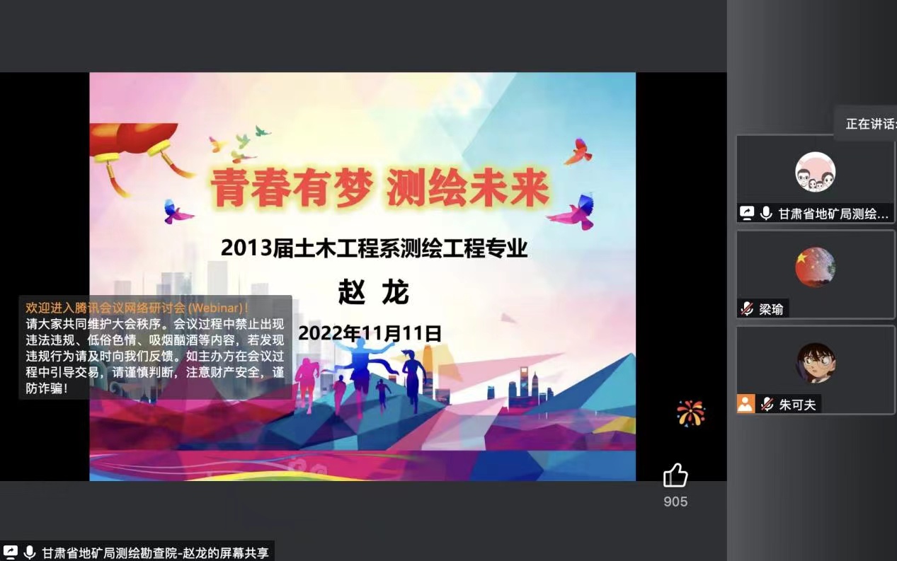 遍交鸿儒友,畅谈青云志。在beat365英国官方网站迎来20周年校庆之际,土木工程学院邀请2013届测绘工程专业优秀校友赵龙,以线上会议的方式为师生开展专题报告。讲座以“青春有梦,测绘未来”为主题,旨在激励在校学子做好人生规划,为将来高质量就业打下坚实的基础,从朋辈身上汲取更多的宝贵经验。